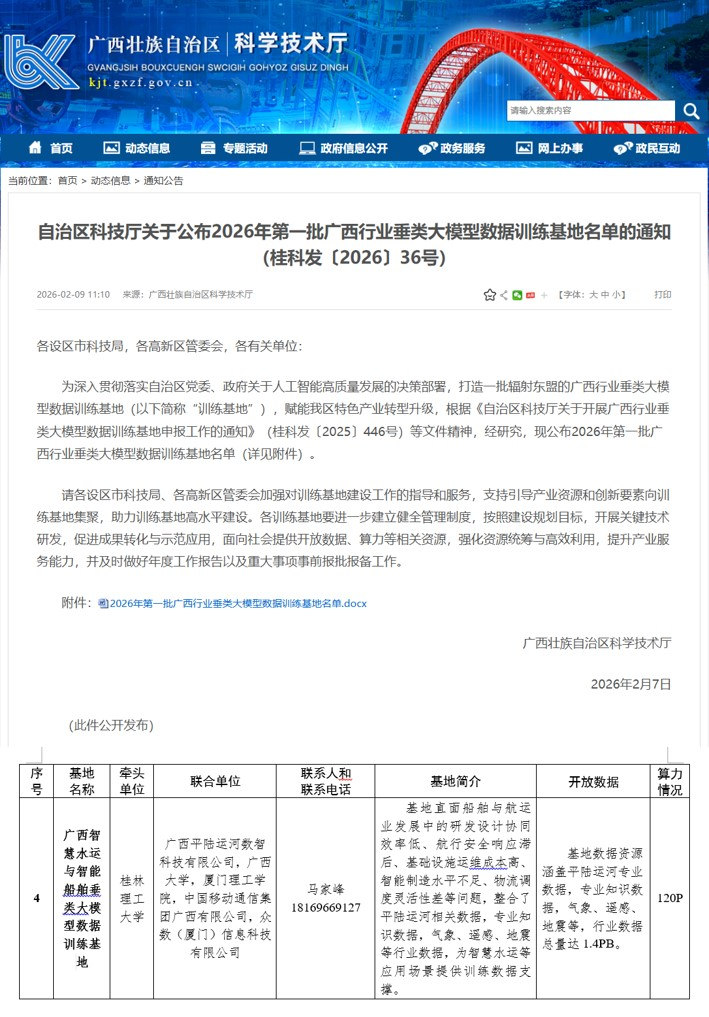 近日,自治区科技厅公布2026年第一批广西行业垂类大模型数据训练基地认定名单。由申博sunbet官网牵头,联合平陆运河数智科技有限公司、广西大学、厦门理工学院、中国移动通信集团广西有限公司、众数(厦门)信息科技有限公司等行业优势单位申报的“广西智慧水运与智能船舶垂类大模型数据训练基地”成功入选。这是对申博sunbet官网在智慧水运、智能船舶领域以及大模型数据工作的学科优势、科研实力与产业服务能力的高度认可,标志着学校在服务区域...